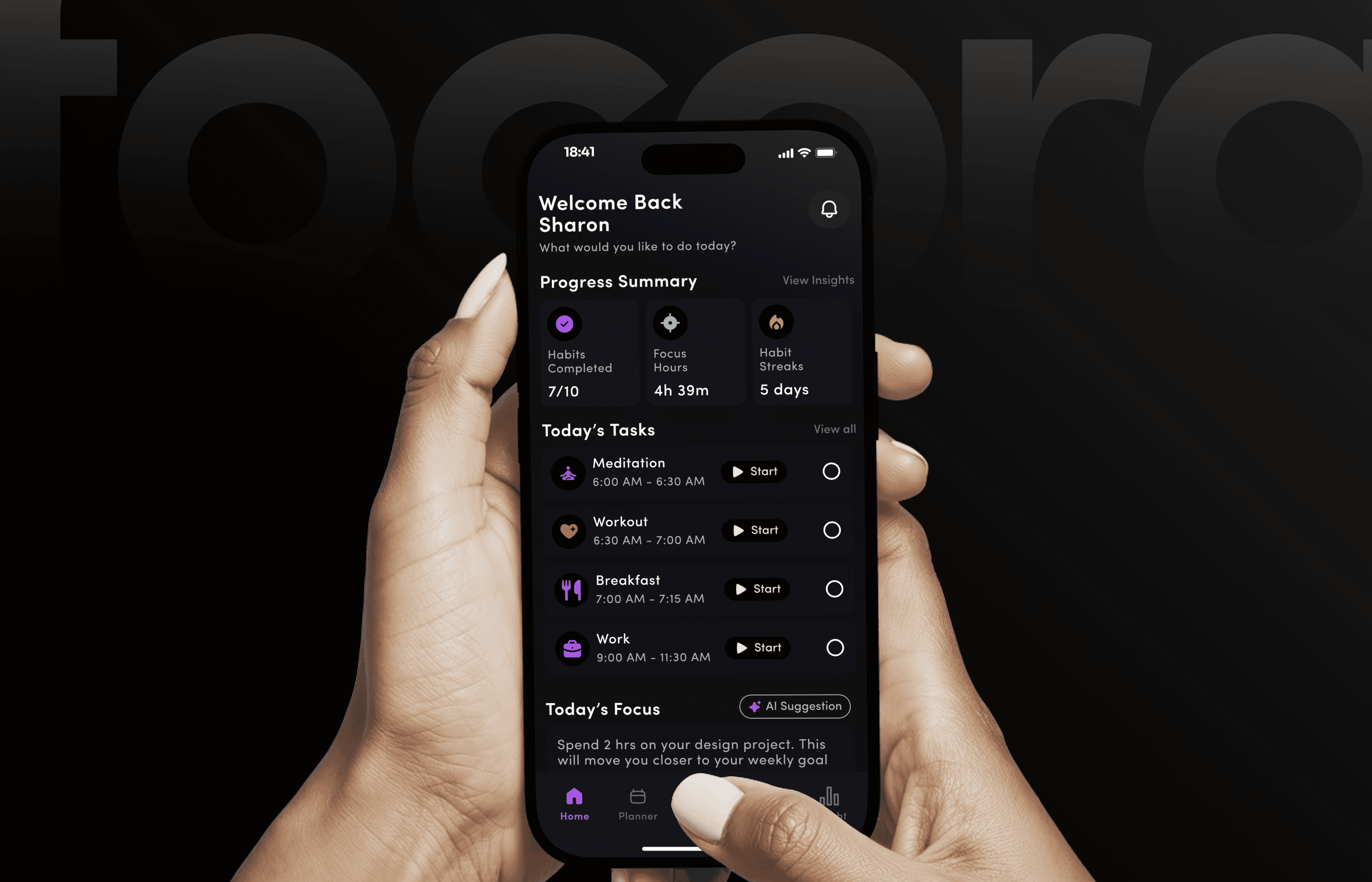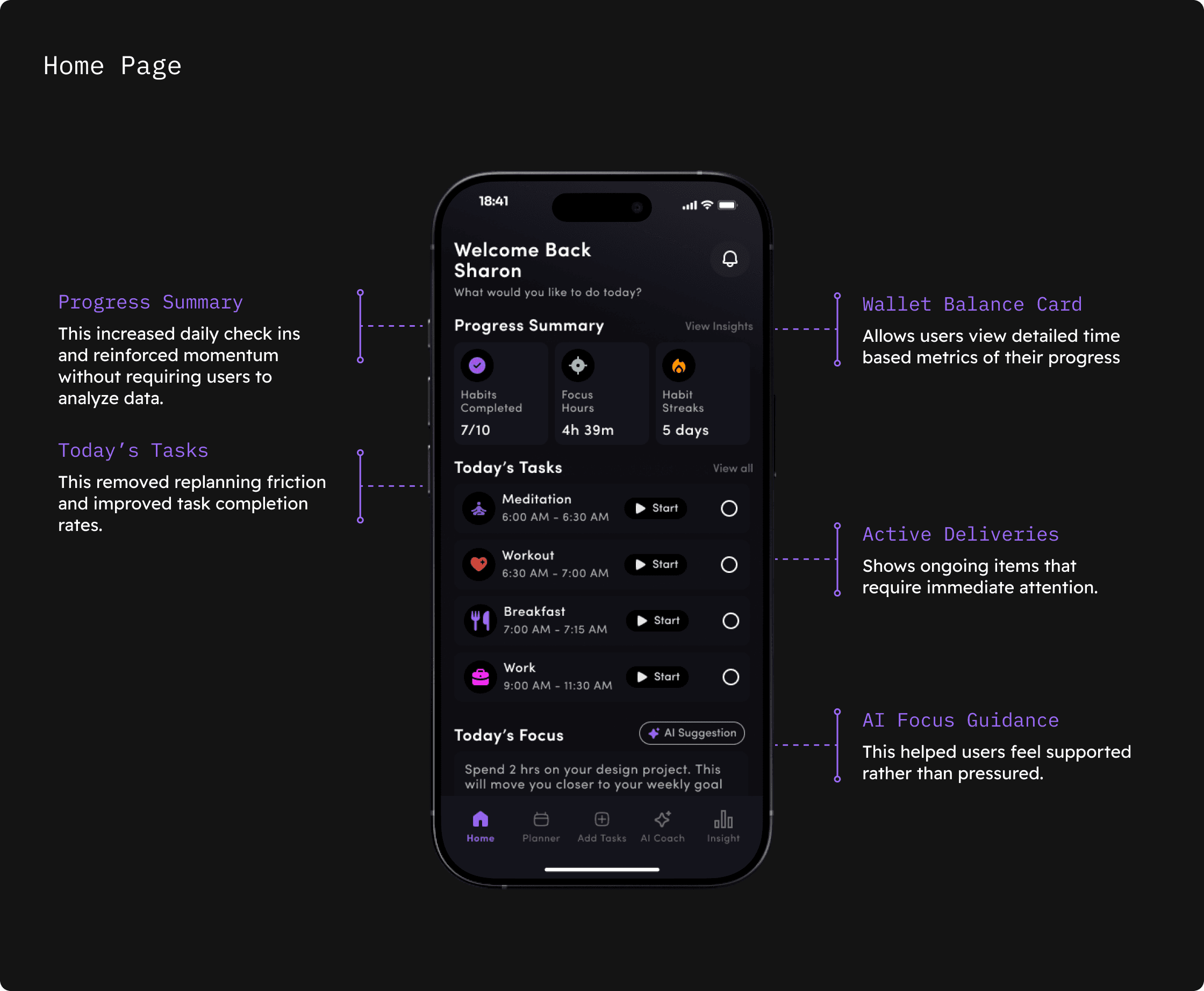 I designed the home screen as a daily command center that surfaces progress, tasks, and focus guidance in one view.