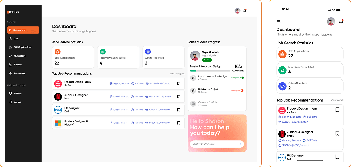 In early 2025, I led the design of Omniss, an AI-powered web application created to solve one of the biggest challenges African designers face: finding jobs that truly match their skills and career goals