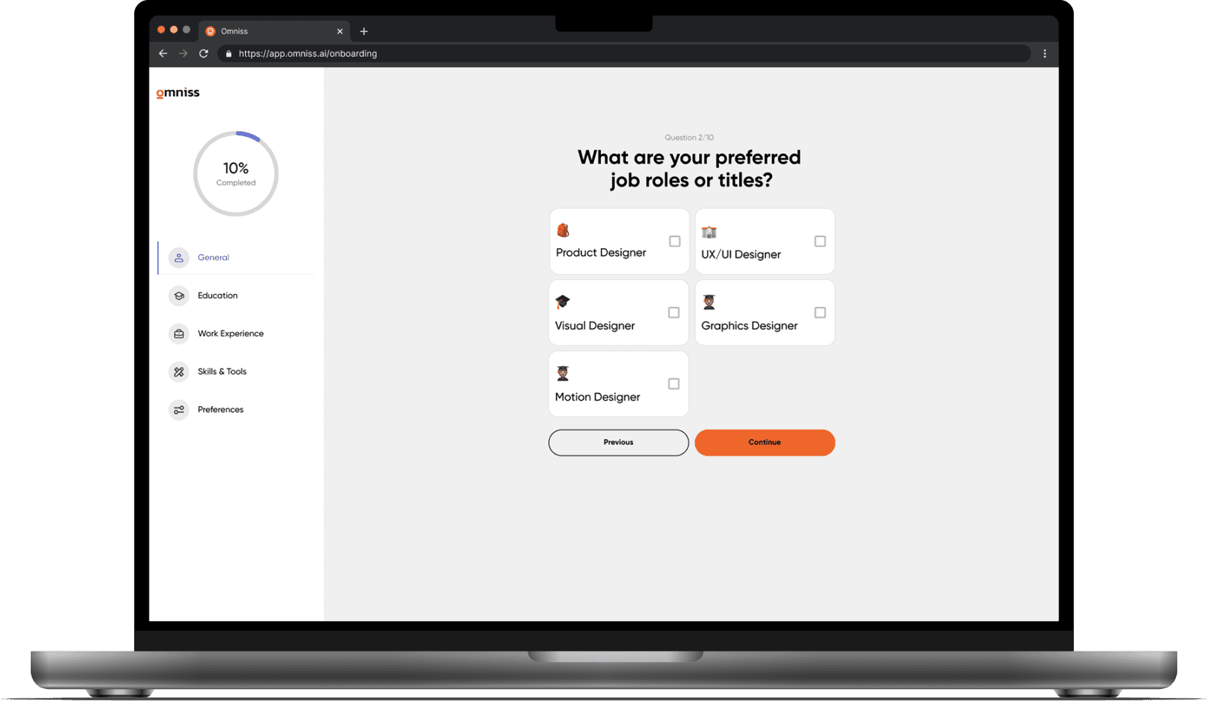 When a designer first steps into Omniss, the experience begins with a journey of discovery — not just for the platform, but for the user themselves. I wanted onboarding to feel less like filling out a form and more like a conversation with a mentor who genuinely cares.
