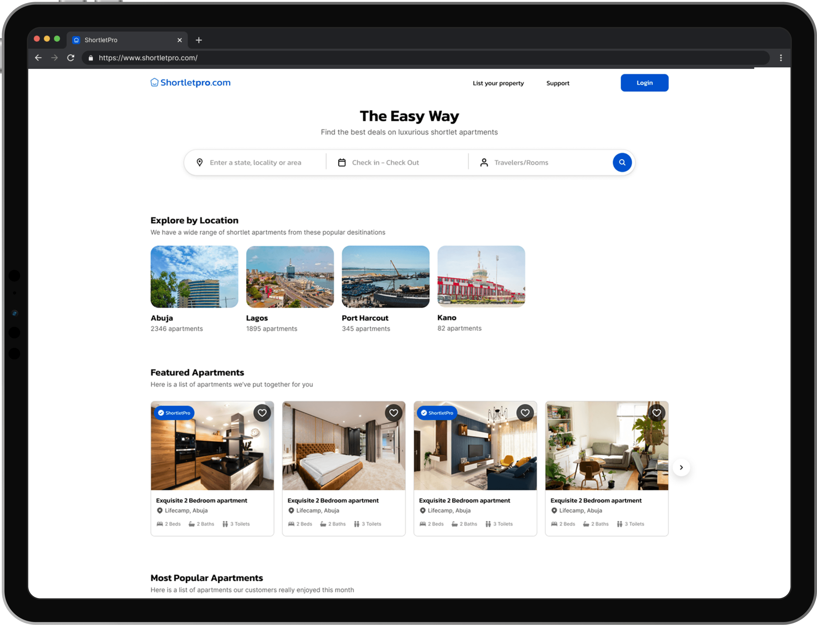 ShortletPro is a digital platform that connects guests with short-term apartments while giving property managers an easy way to list and manage their properties. I worked as the sole UX/UI Designer, responsible for designing the responsive web app (for guests, property managers, and administrators) as well as the mobile app (for logged-in users and guest access).